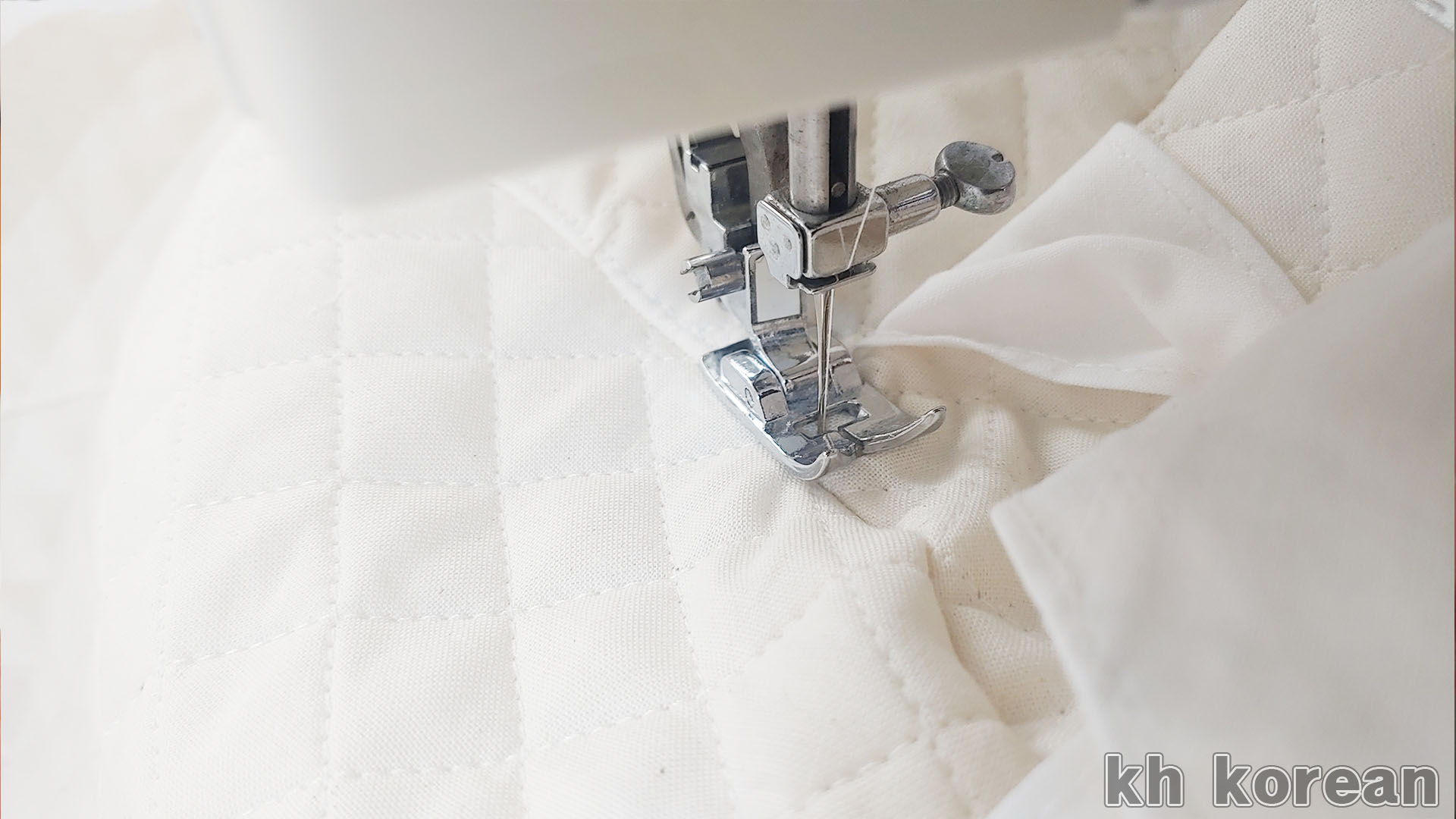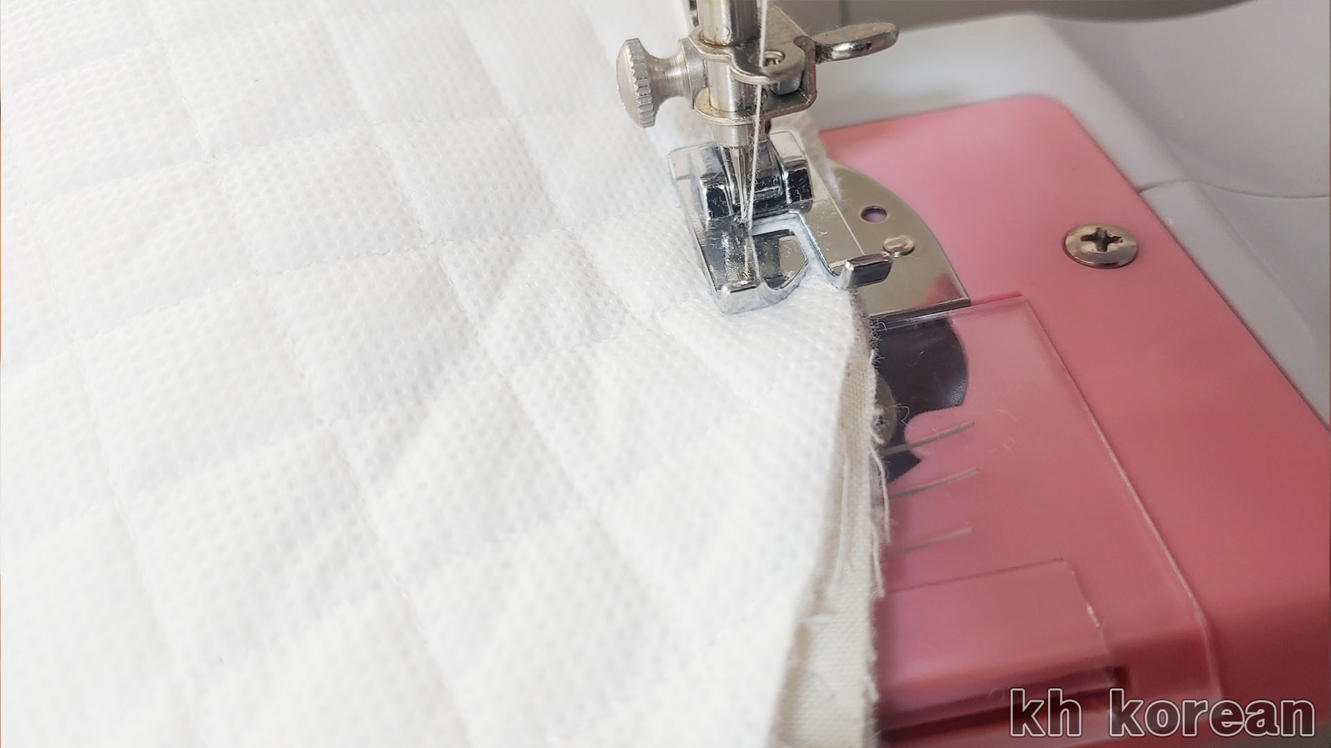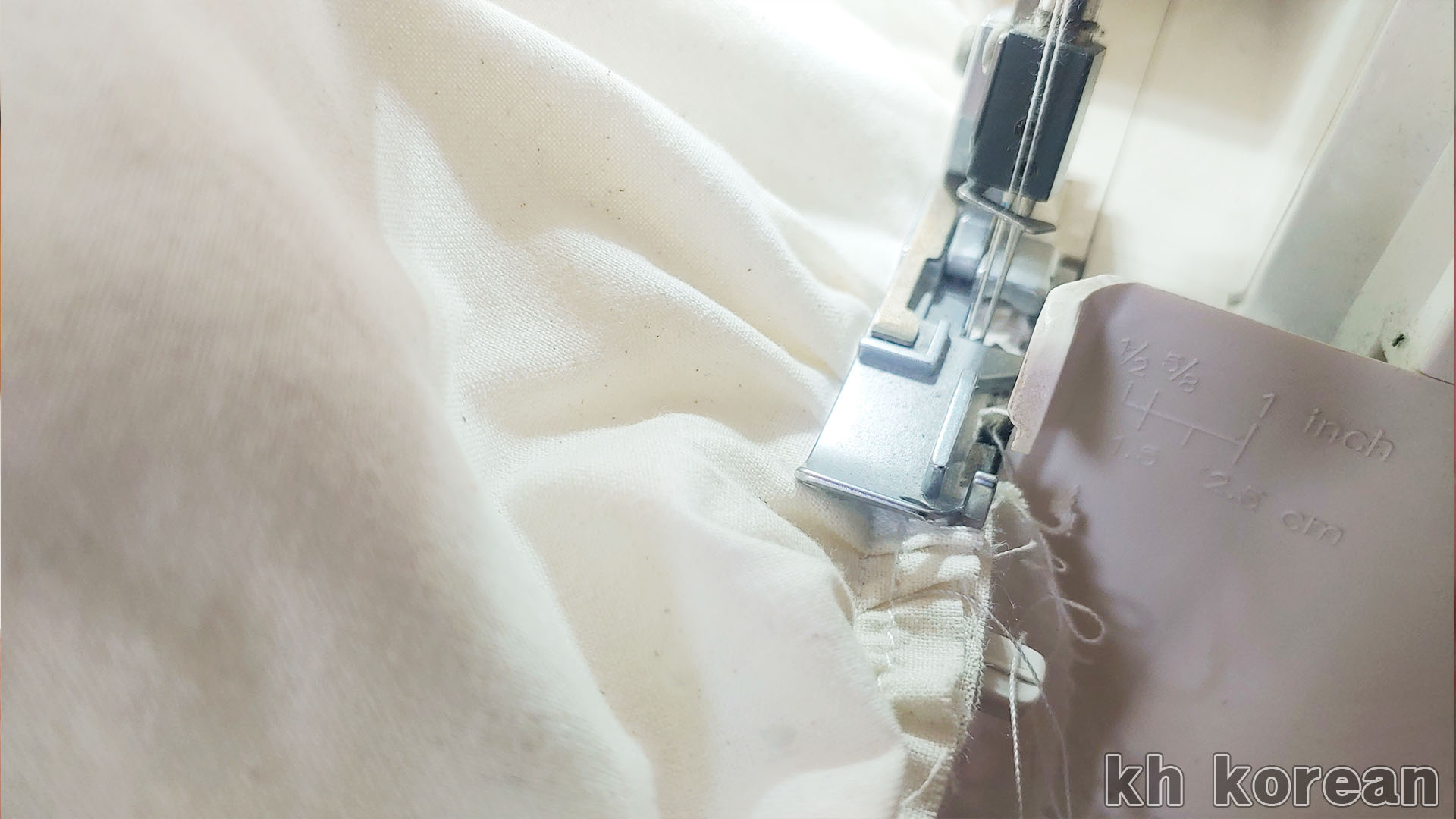 이 부분은 정면의 높이 라인을 재봉하는 모습인데, 누빔지 두 겹과 광목 원단으로 제작한 리본 감을 함께 재봉한 것입니다.