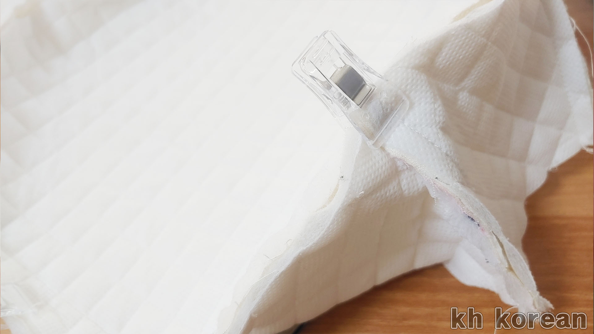 갑자기 두께가 올라가면 원단이 노루발의 고리 앞쪽에서 걸려서 못 지나가거나 바늘 위치가 흔들릴 수 있으므로 위의 모양대로 잘라서 작업해주시면 편하게 가능합니다. 제 경우에는 끝 부분이 벌어져있지만, 재봉이 끝까지 잘 이루어져 있다면 보다 수월하겠지요.