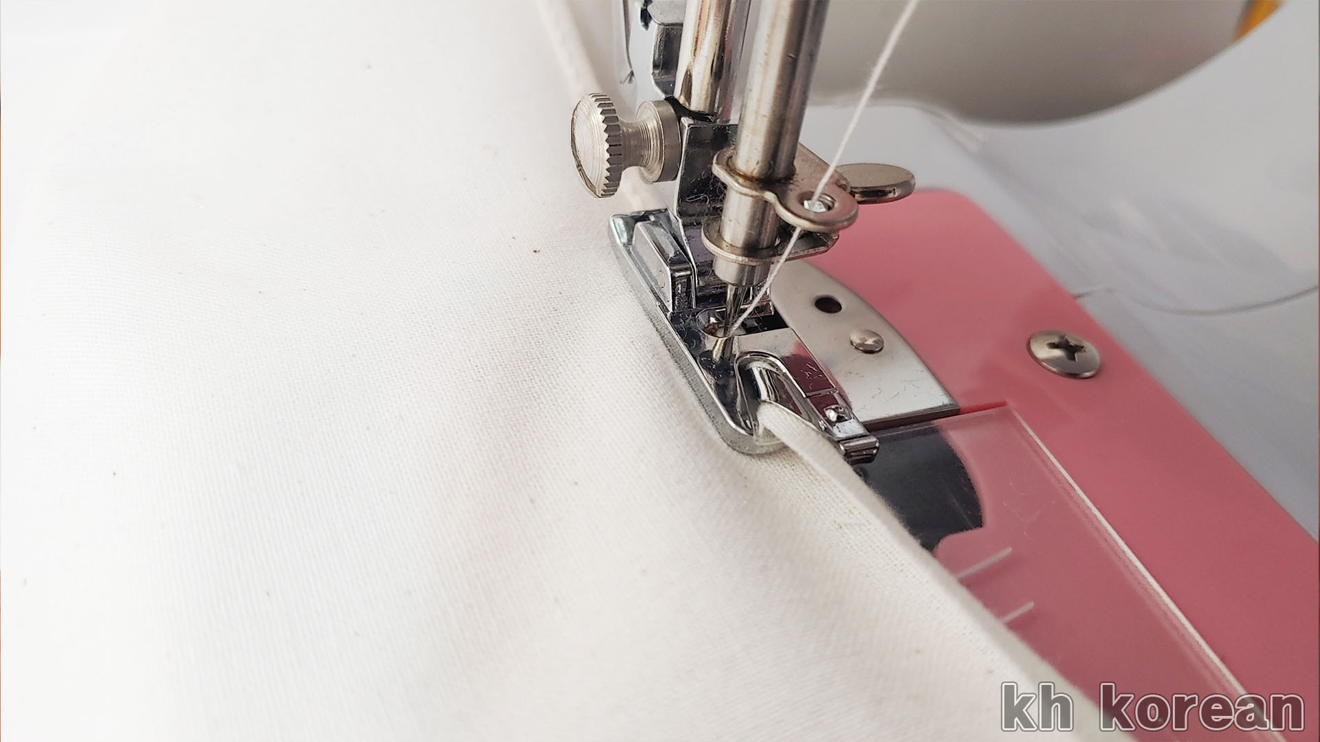 미니 재봉틀로 재봉을 시작할 때 너무 끝에서 시작을 하면 원단이 뒤로 잘 안 밀리는 경향이 있습니다.