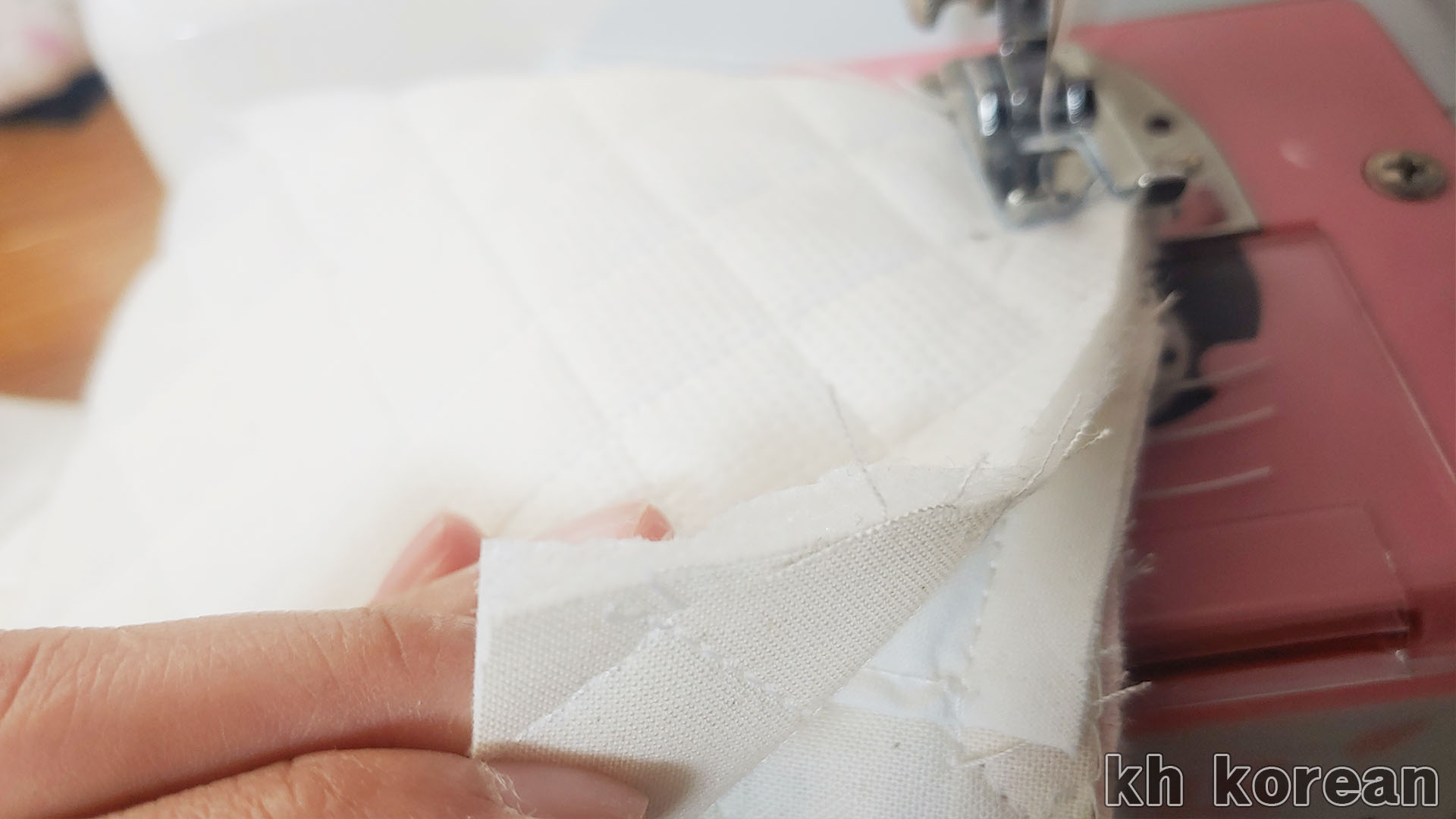 이 부분은 정면의 높이 라인을 재봉하는 모습인데, 누빔지 두 겹과 광목 원단으로 제작한 리본 감을 함께 재봉한 것입니다.