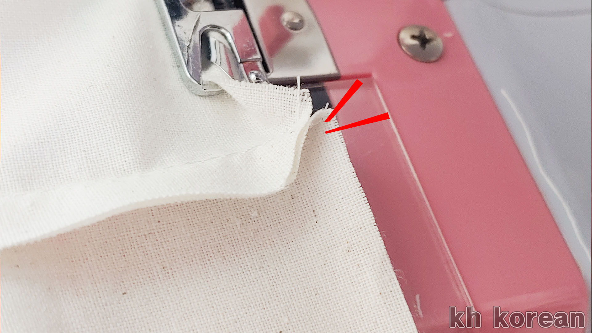 미니 재봉틀로 재봉을 시작할 때 너무 끝에서 시작을 하면 원단이 뒤로 잘 안 밀리는 경향이 있습니다.