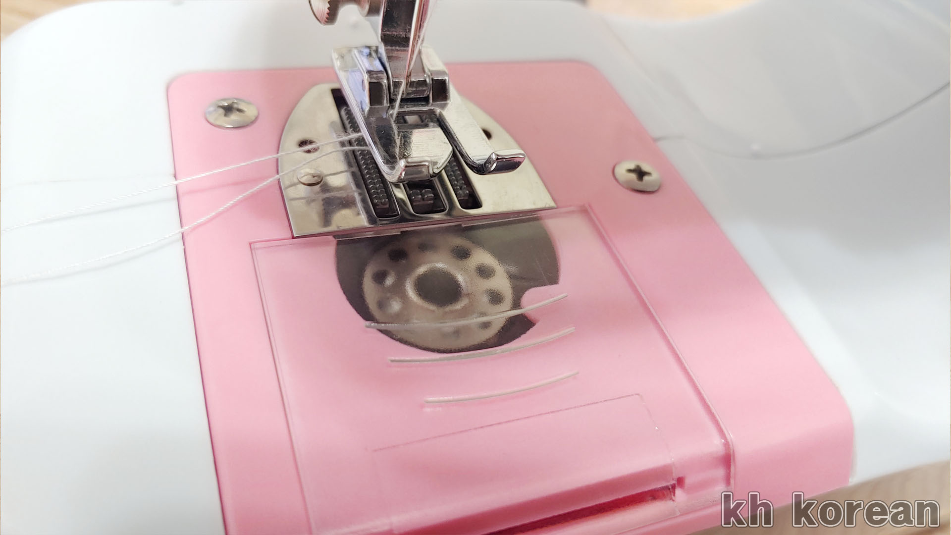 설명서 이미지에는 실까지는 잘 보이지 않지만 위쪽의 저 구멍에 끼우는게 효과적인 것 같은데 바늘이 들려있으면 본체밑으로 숨어들어가기 때문에 바늘을 내리고 걸어주어야 하는 점도 좀 아쉽습니다. 옆으로 넣는 약간의 틈이 있었으면 더 좋았을지도.
