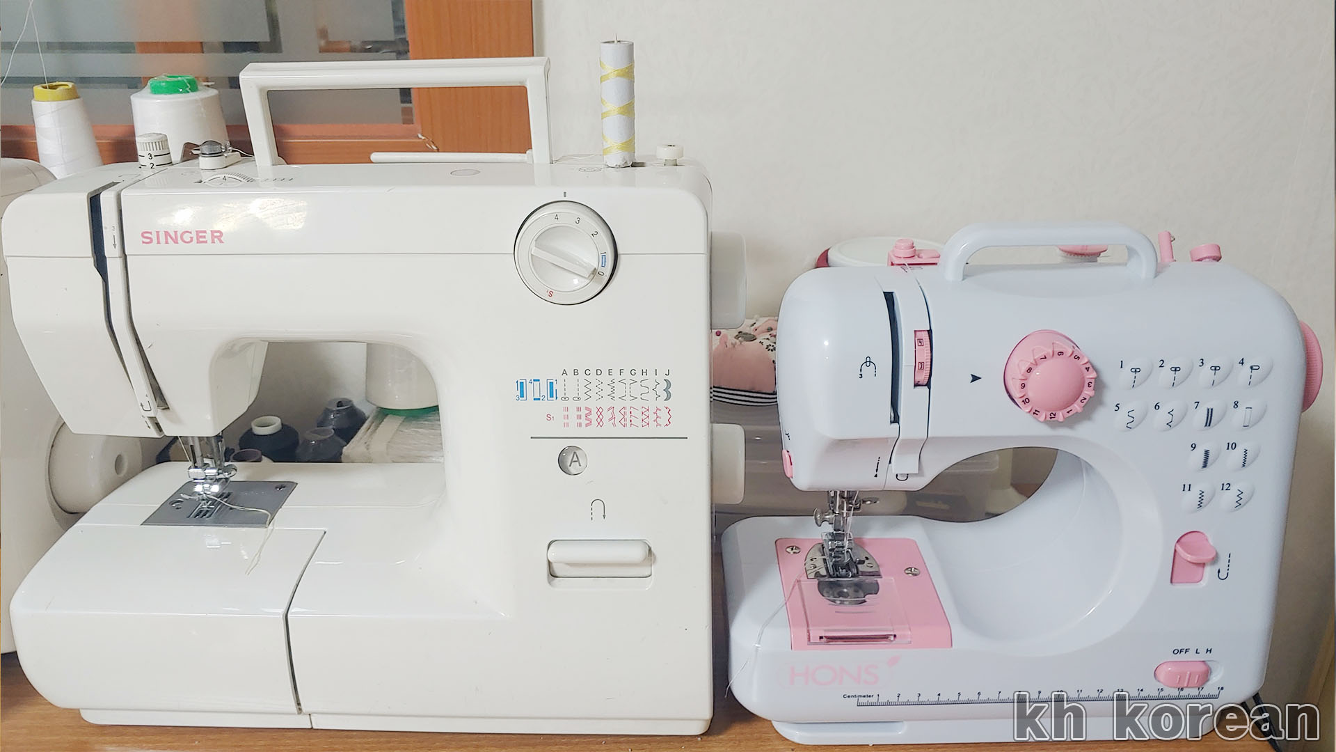 싱거가 오래되어 누렇게 변색도 되고 했지만, 가정용 재봉틀의 일반적인 사이즈라 비교하는데에 도움이 될 것으로 보입니다. 사실 기본 기능 면에서는 큰 차이가 없어 보입니다.