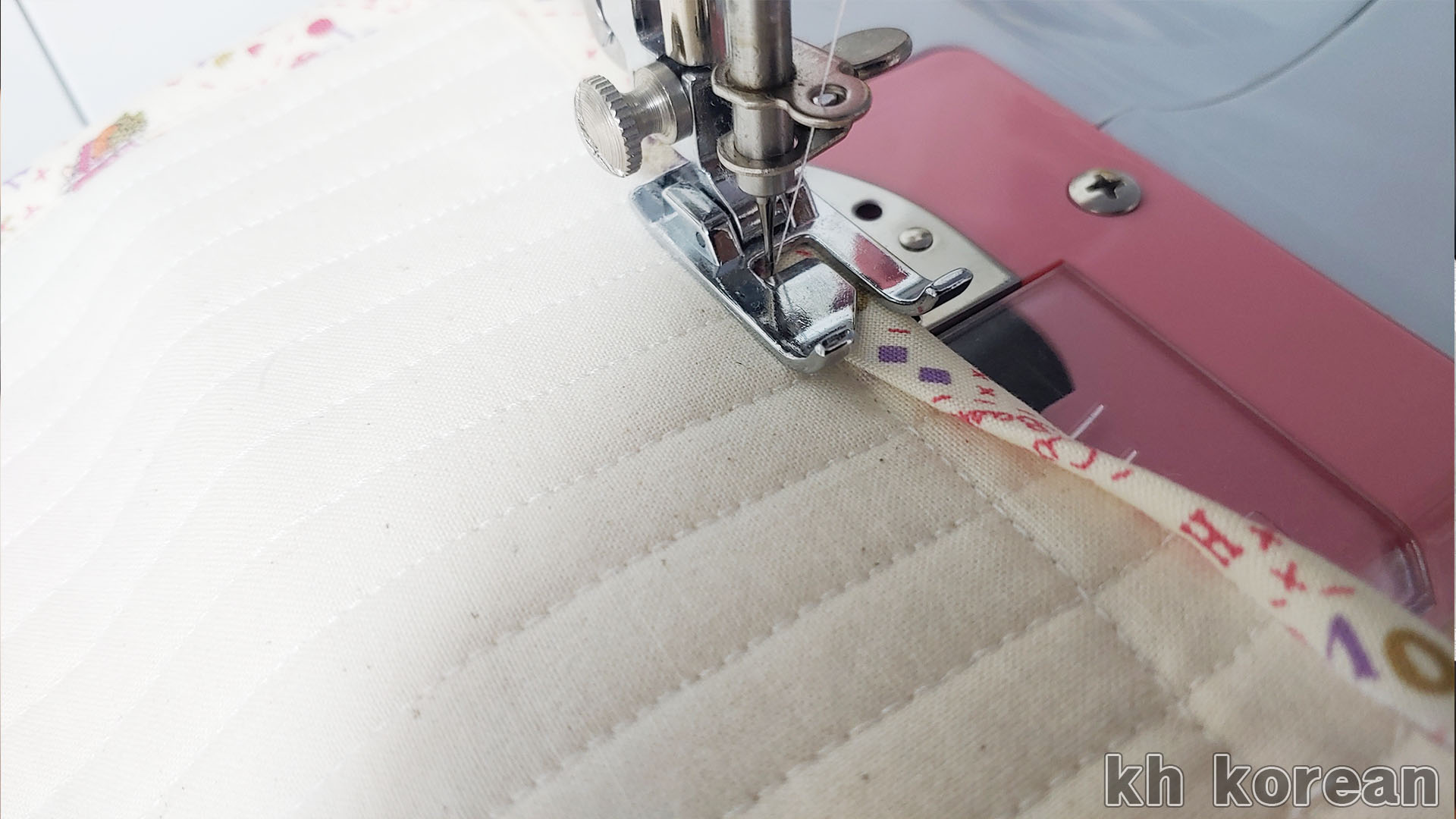 다림질을 하기 너무 귀찮아서 바이어스 테이프를 접어가며 쭉쭉 재봉했습니다.