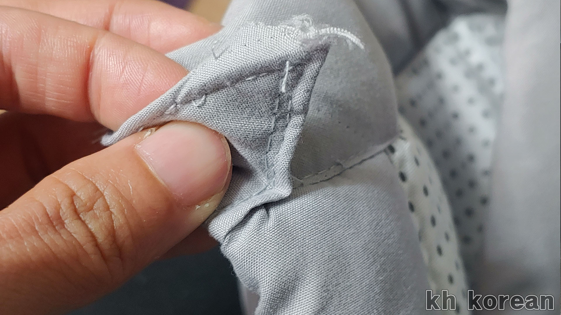 그리고 한쪽을 등받이 쪽에 끼워 넣어주면 완성인데, 이때 중요한 점은 극세사의 결이 있으니 극세사 모의 끝이 앞쪽을 향하게 해야 합니다.