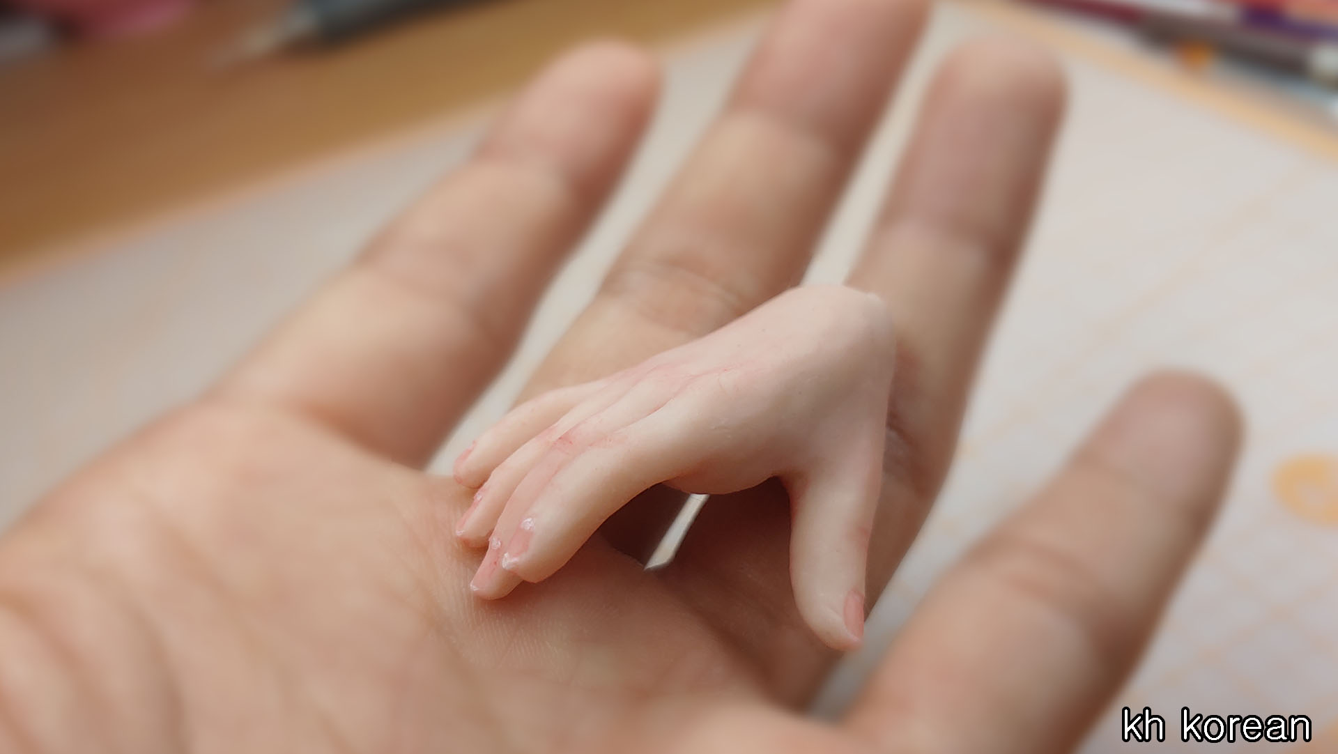 함께 일하던 분께서 손에도 표정이 있는 것 같다는 말씀을 하신 적이 있는데 그 말을 듣고 엄청나게 공감을 했던 일이 기억납니다. 손가락의 마디 표현과 위치 등을 변형하여 포즈를 만들어주면 완성이 되었을 때 이미지가 실사에 더욱 가까워지기도 하고, 인형의 표정을 극대화하는 데에 영향을 주기도 합니다.