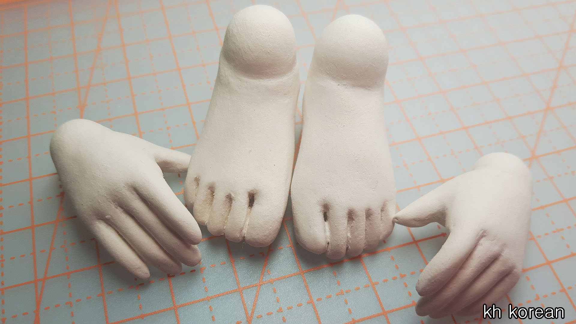 발 조형에서 또한 마찬가지로 발가락 모양만 대략적으로 만들어놓고 사용하기도 했는데 손에 비해 발가락은 짧고, 가동 범위와 유연성 등이 더 낮기 때문에 큰 차이를 느끼지는 못했습니다. 다만, 발가락 사이사이 등 미세한 부분을 디테일하게 깎는 구간이 줄어드는 것이 장점으로 작용되기는 합니다.