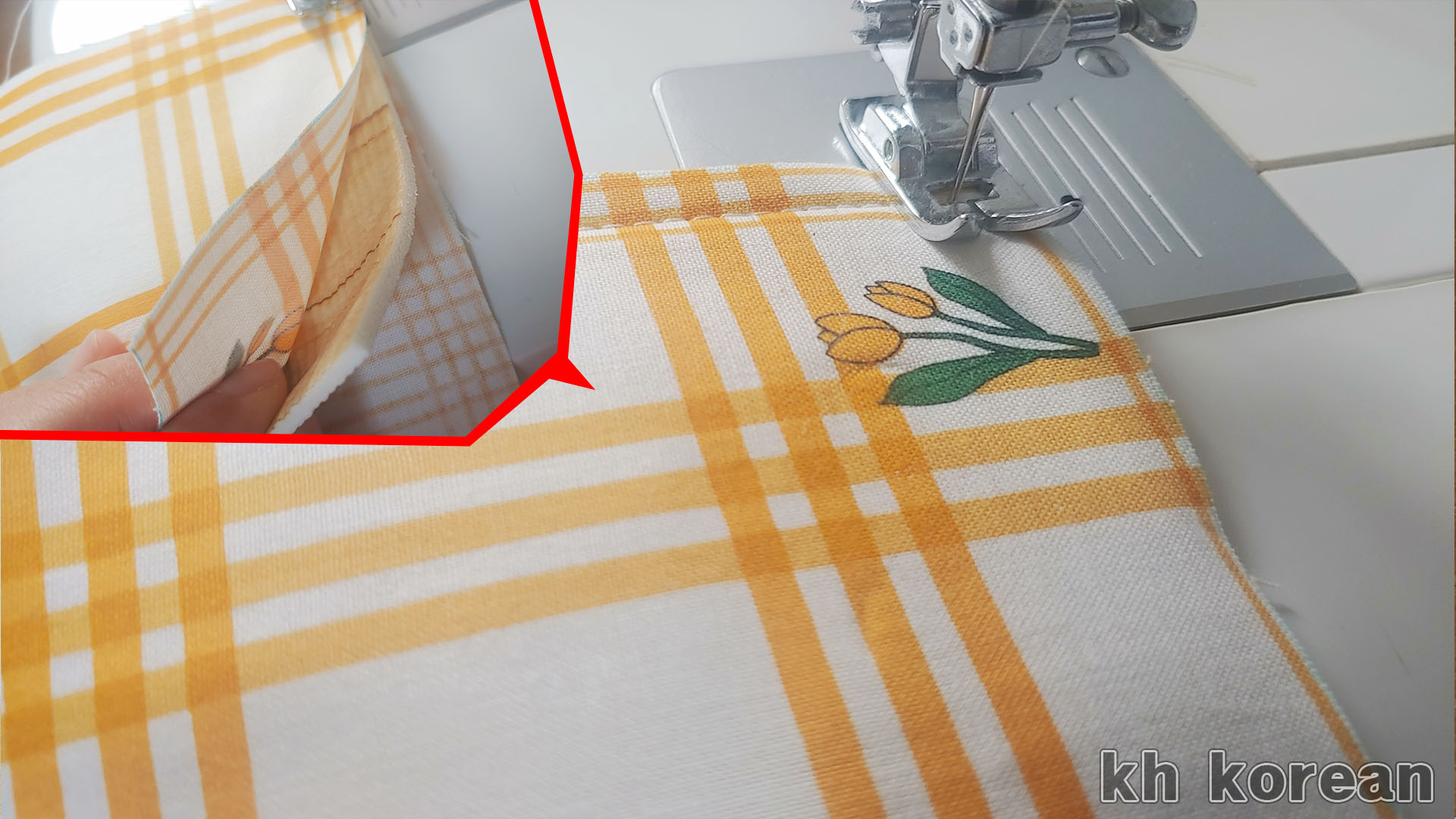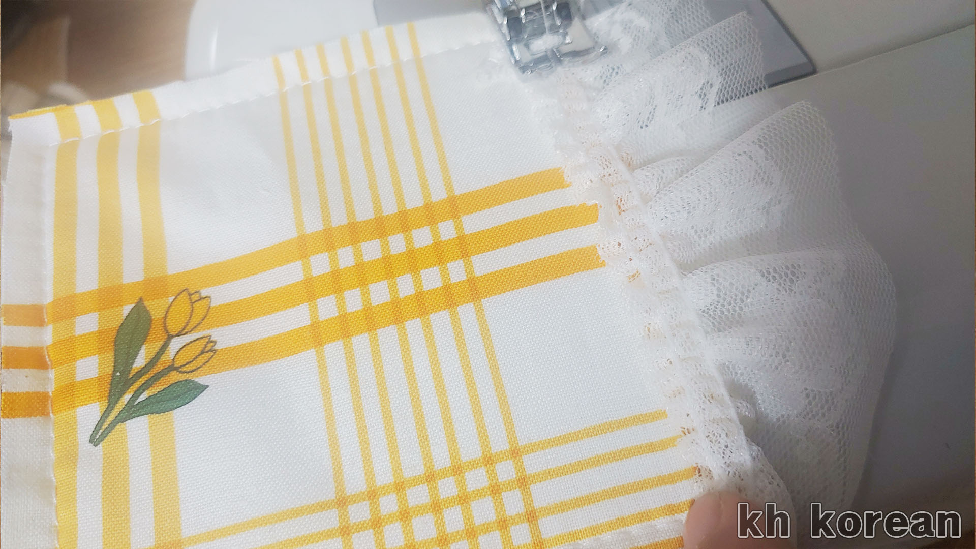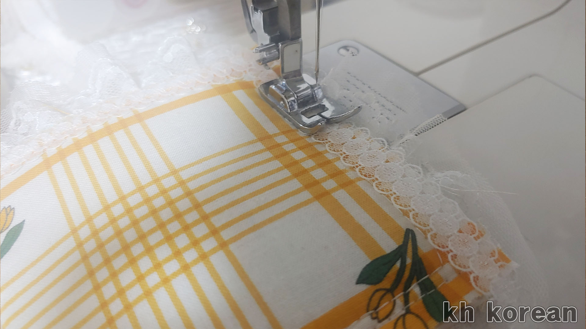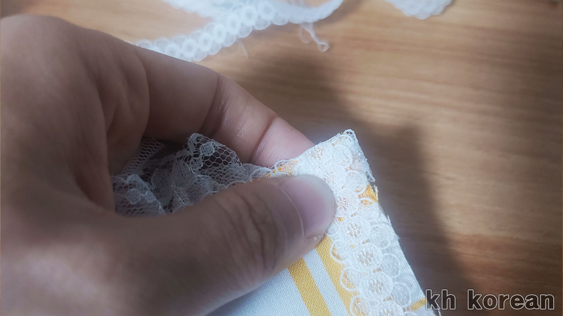 네 부분의 레이스를 조금 넉넉히 잘라주어 위처럼 겹쳐지는 모서리 부분을 뒤쪽으로 감싸서 재봉했습니다.