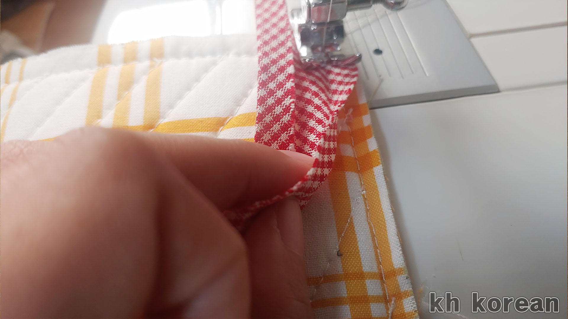 제 경우 이번 작업에서는 사진에 잘 보이게 하려고 빨간색을 사용했는데, 사실 메인 몸판이 두께가 두꺼운 경우에는 이런 흐느적거리는 면 소재의 바이어스보다는 린넨 등의 탄탄한 소재가 훨씬 좋긴 합니다.