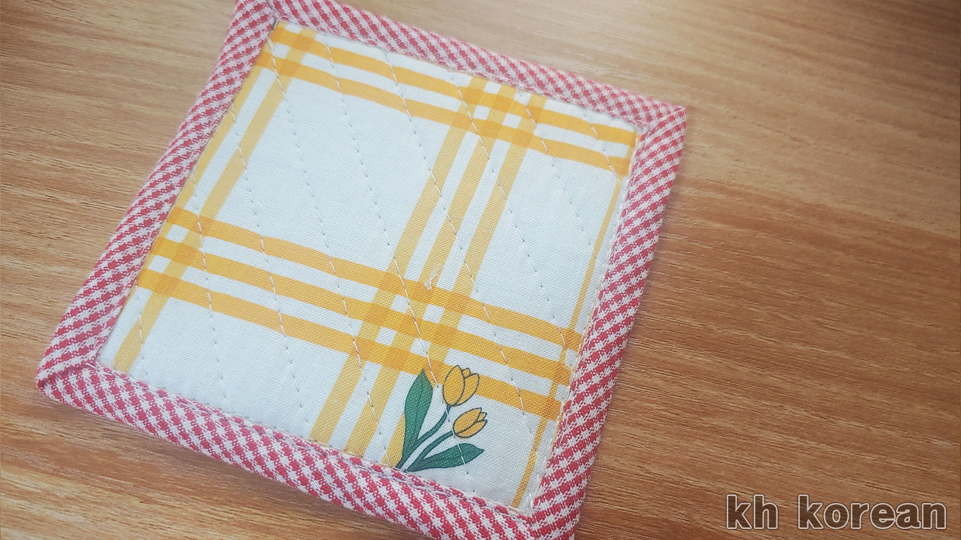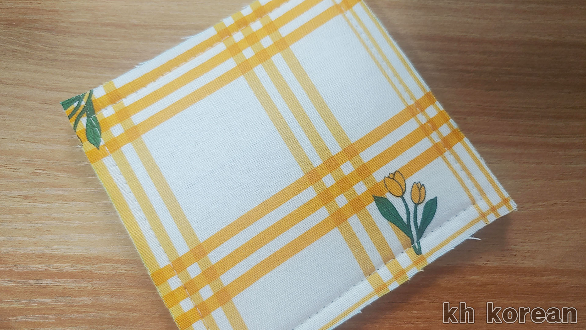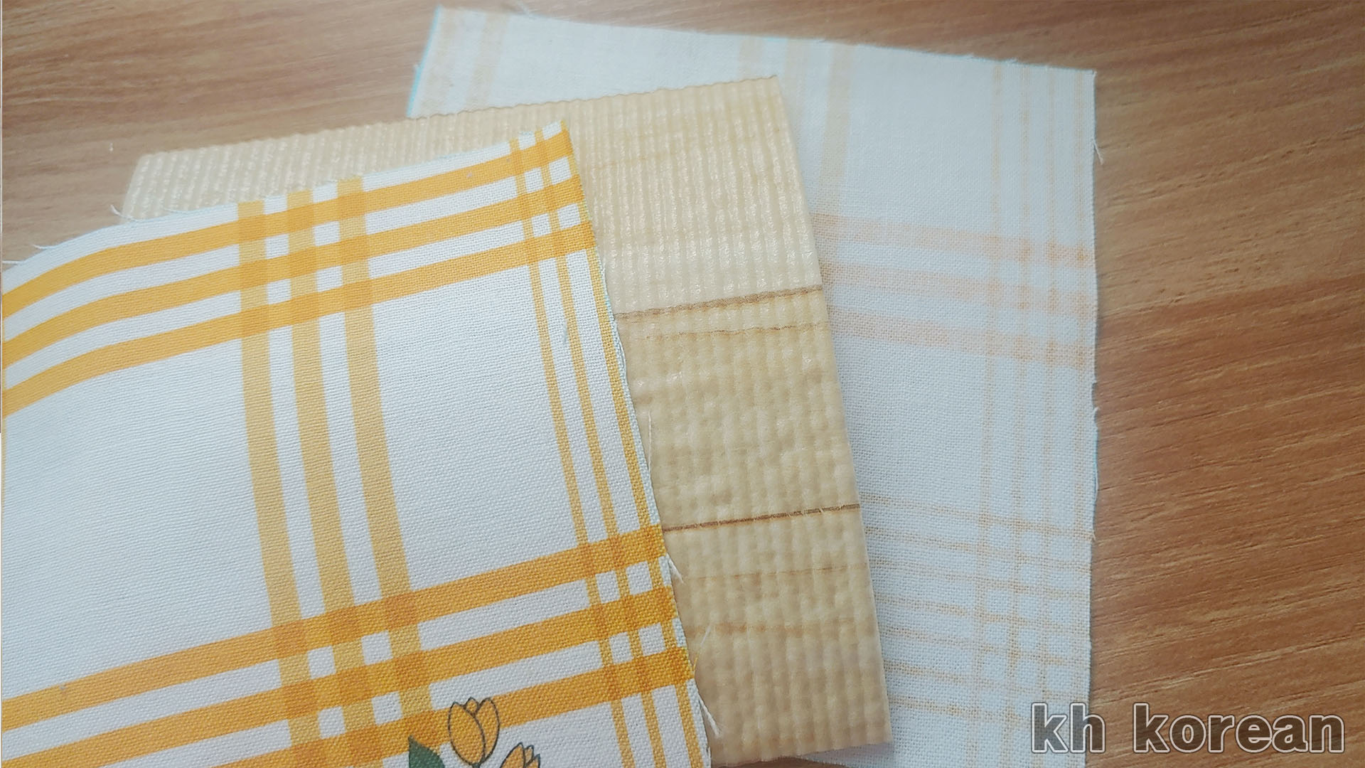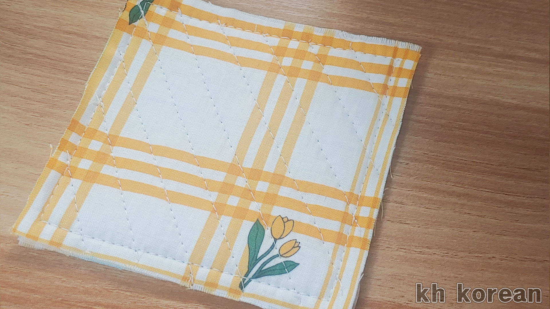 참고로 실제 사이즈는 시트가 가로세로 동일하게 10.5cm, 원단은 혹시 누빔 후에 짧아질까 봐 가로세로 0.5cm의 여유분을 두고 11cm로 잘랐는데 결국 재봉 후 시접 0.5 정도가 그대로 잘려나갔습니다.