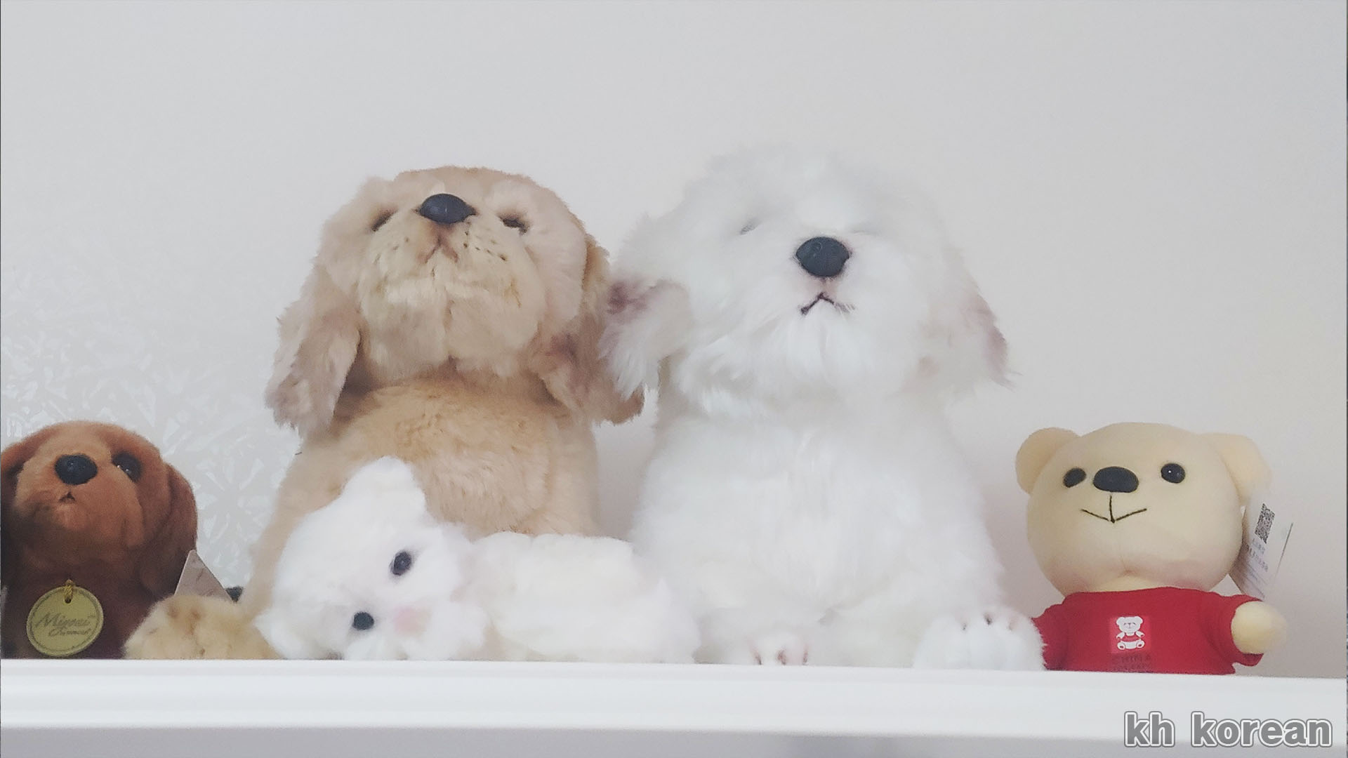 이렇게 태어난 화이트 개냥이는 지금은 거실 TV위의 인형들과 함께 집을 지키고 있습니다.