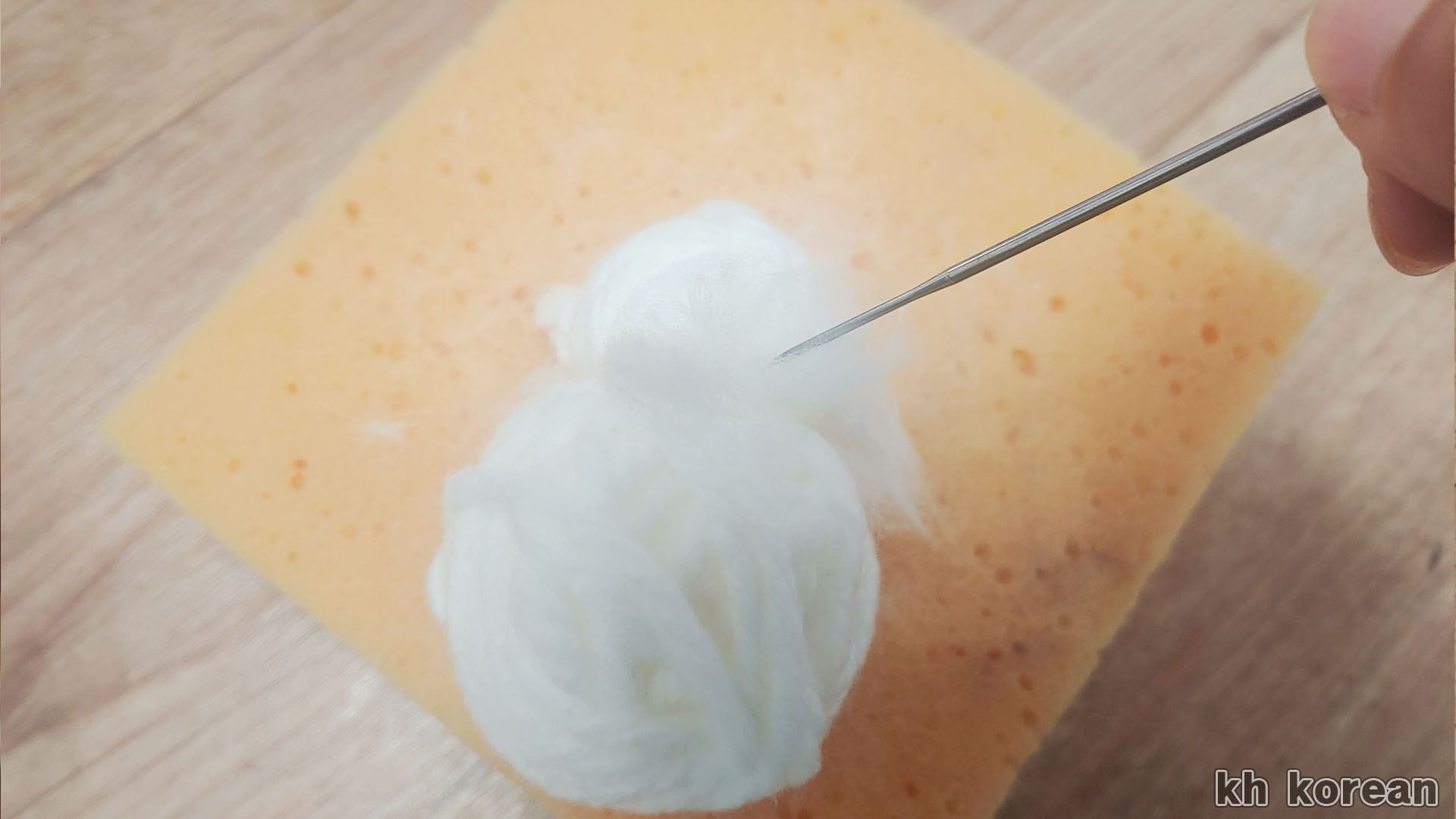 털실의 끝 부분은 매듭없이 안쪽으로 쑥 넣어주었습니다. 그 부분을 시작으로 양모펠트를 눌러주면 털실의 끝부분이 함께 엉키면서 빠져나오지 않기 때문에 간단히 만들 때에는 괜찮은 것 같습니다.
