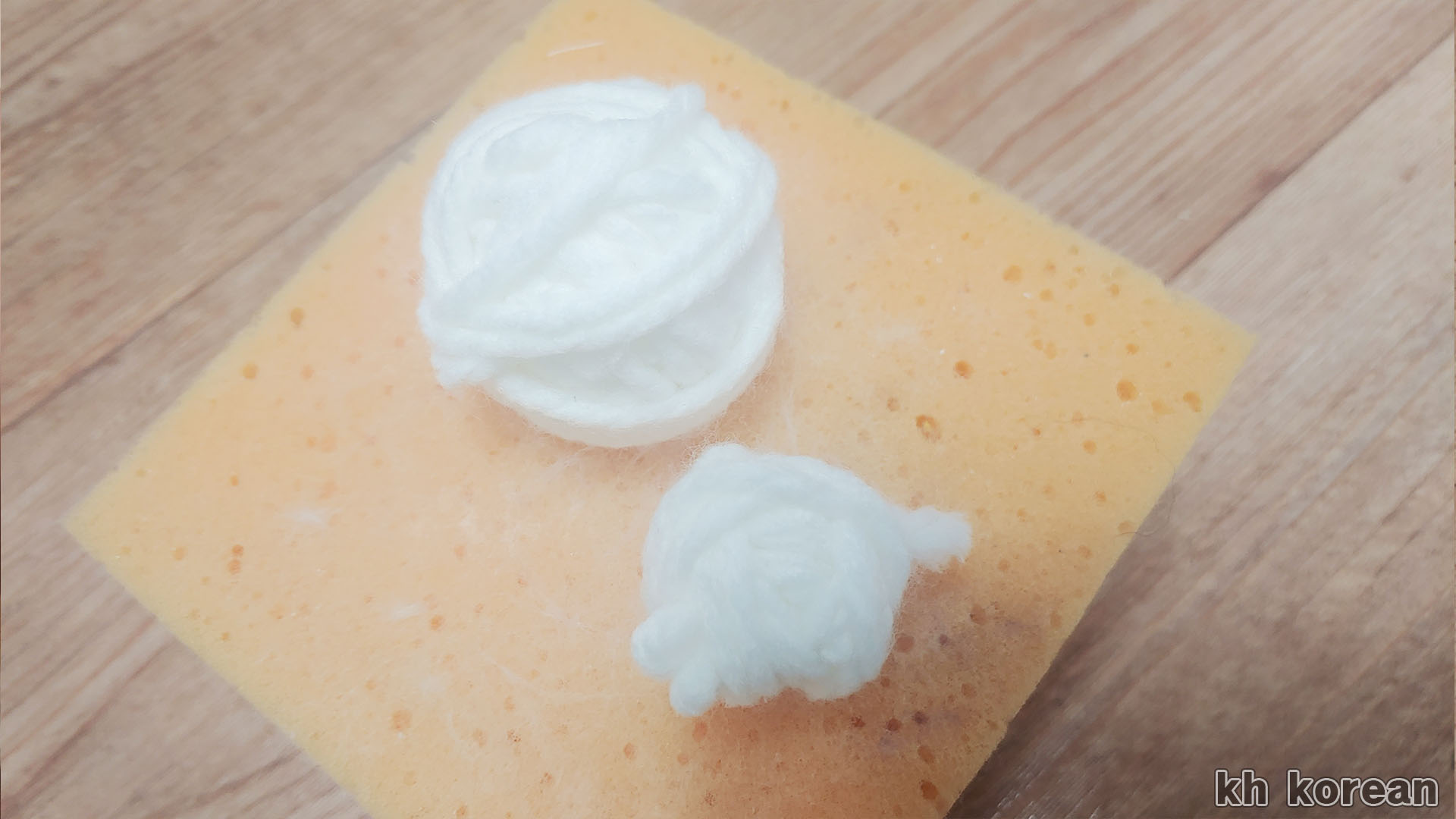 털실을 뭉쳐서 모양을 내는 과정은 매우 간단하지만 그만큼 원하는 모양을 내기가 쉽지 않기 때문에 잔머리를 좀 써봅니다. 동물 바디는 어쨌든 원형은 아니기 때문에 물방울 모양 비슷하게 만들어보고 싶어서 동그란 구를 크게 하나, 작게 하나 이렇게 두 개를 만들었습니다.