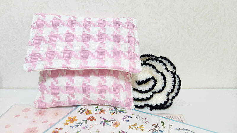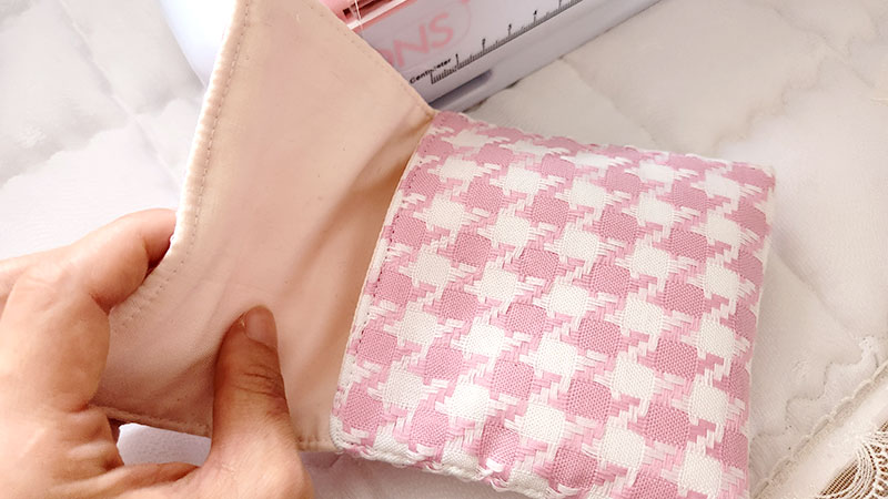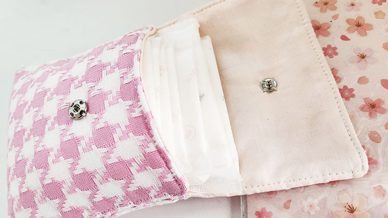 옆면이 손바느질로 공그르기 되어 재봉틀로 두 겹을 눌러박을 때보다 유연하게 벌어지기 때문에 최대 수납공간이 더 커지게 됩니다. 생리대 중형 2개, 팬티라이너 5개가 들어가는데 더 넣어도 들어는 갈 것 같네요.
