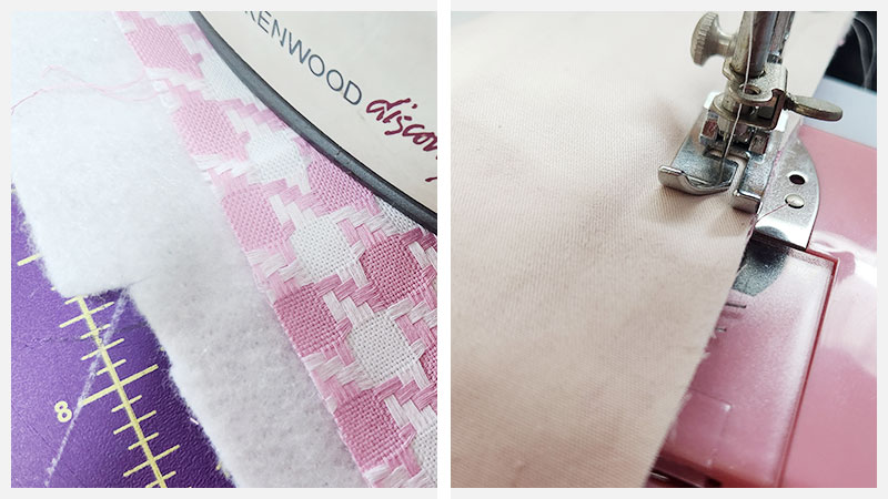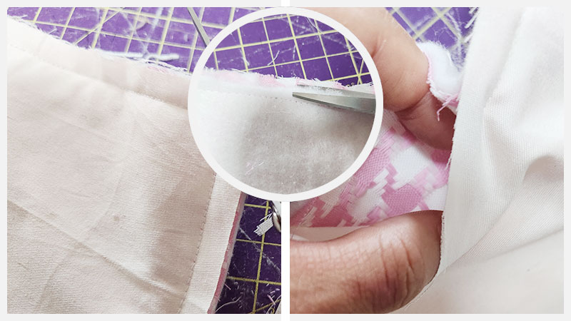 보통은 시접 부분을 빼고 부착을 하시던데 어쩌다가 세탁이라도 하게되면 안쪽에서 솜이 떨어진 게 느껴질 때가 있기 때문에 제 경우 끝쪽을 재봉틀로 살짝 밟는 형태로 제작을 해요. 그런데 이번에는 사이즈가 같으니, 세 겹을 창구멍을 남기고 재봉해 준 후 위쪽 중앙의 원 안에 있는 사진과 같이 솜의 불필요한 시접 부분을 잘라내 주었습니다.