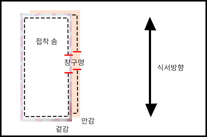 창구멍은 긴 쪽의 직선 라인에 내주는 게 재봉을 할 때에도, 뒤집을 때에도, 막아줄 때에도 편리합니다.